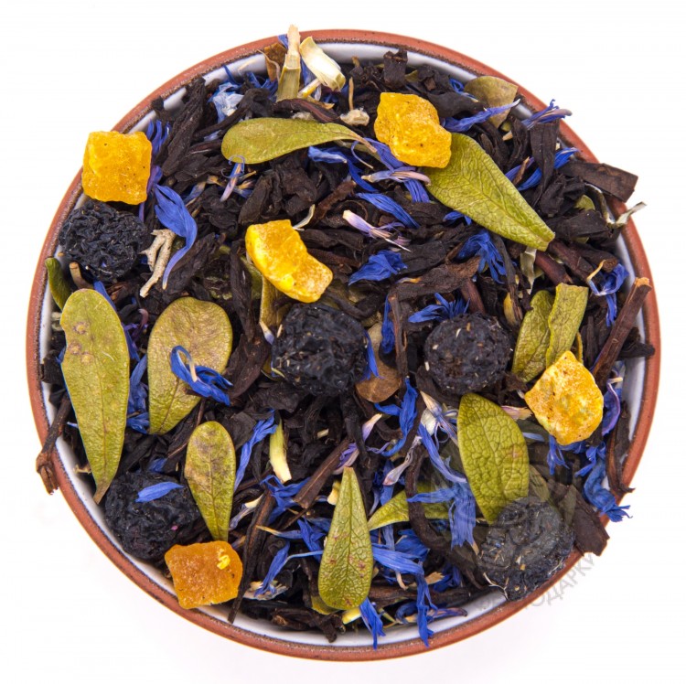 Чай черный индийский, кусочки ананаса, ягоды черники, лепестки василька, листья брусники, аромат черники и сливок.