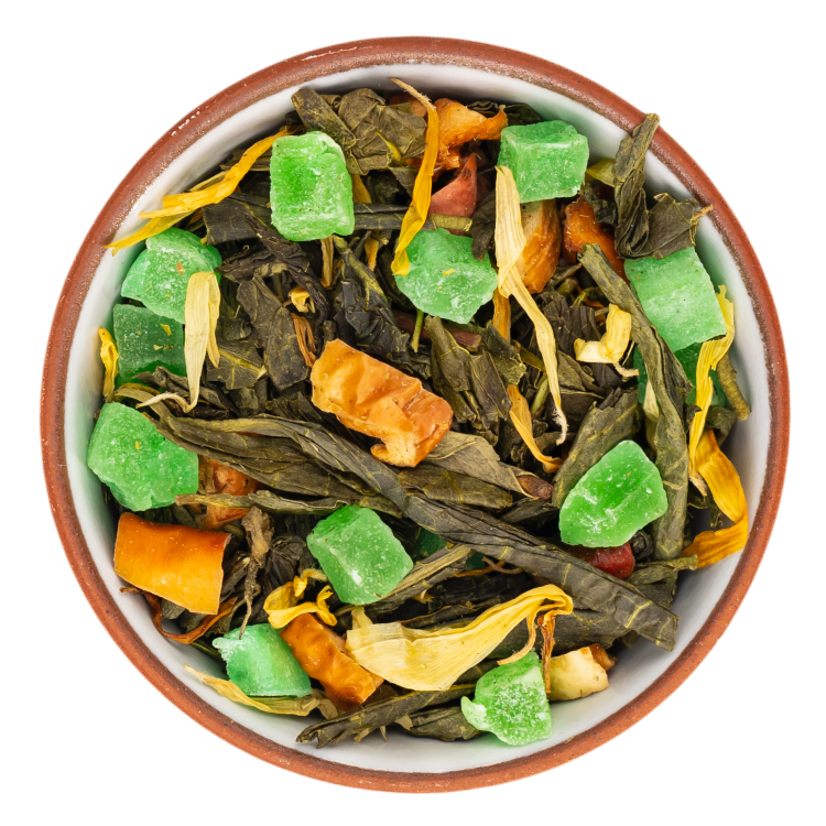 Китайский чай Сенча, кусочки груши и яблока, цукаты ананаса, лепестки календулы, ароматизатор